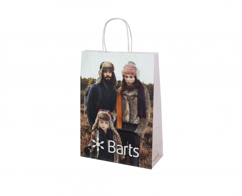 Shopper versatile e resistente con stampa flessografica in quadricromia e pantone, manico in carta arrotolata.