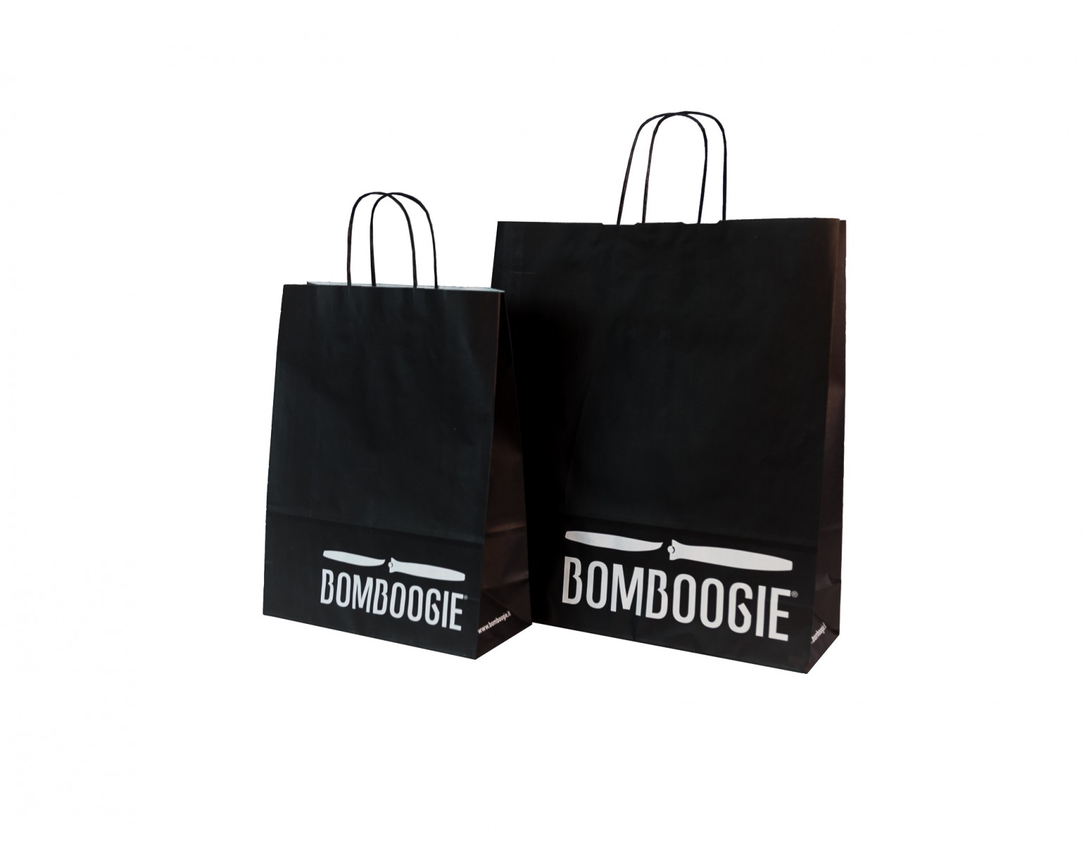 Shopper realizzata in carta, con stampa del logo Bomboogie in 1 colore all over, per una forte identità visiva ed economica.