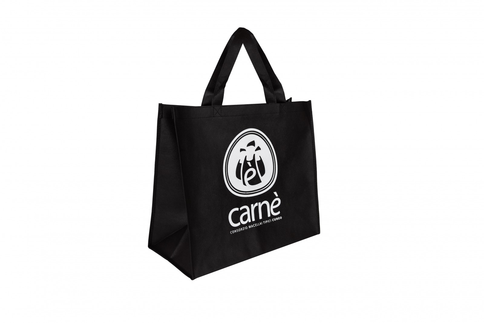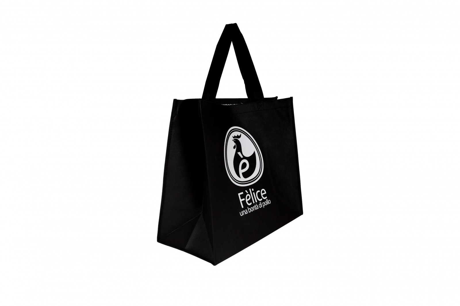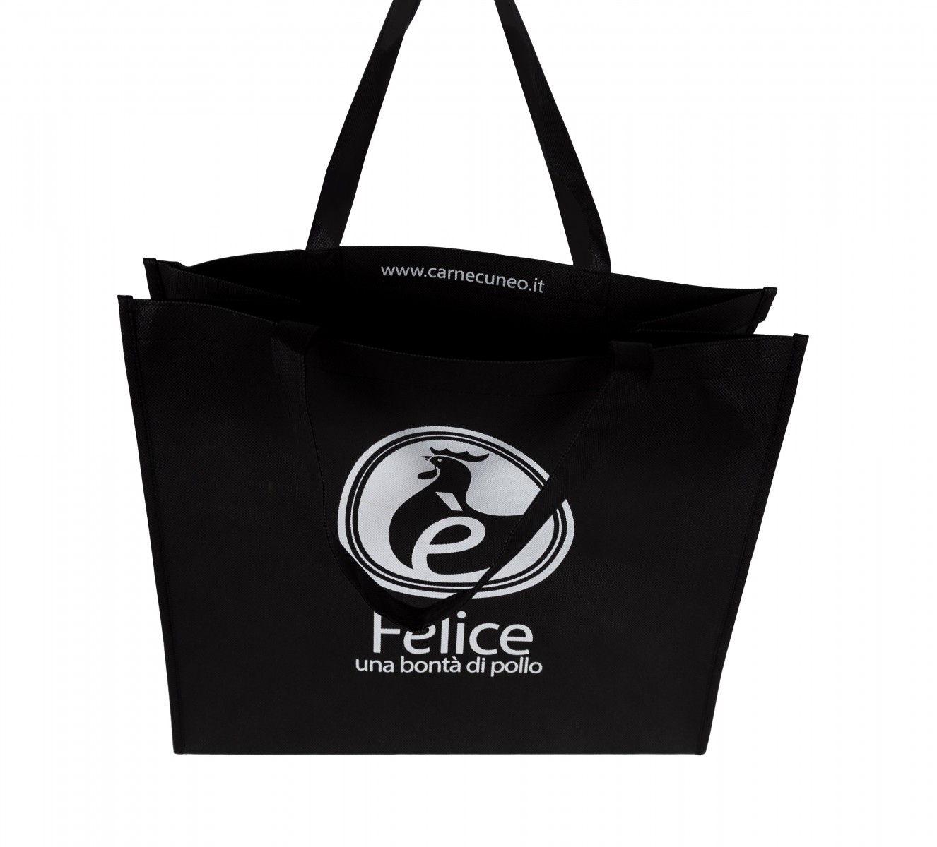 Shopper realizzata in TNT nero da 100 gr, materiale leggero ma resistente, studiata specificamente per il trasporto alimentare e il riutilizzo facile.