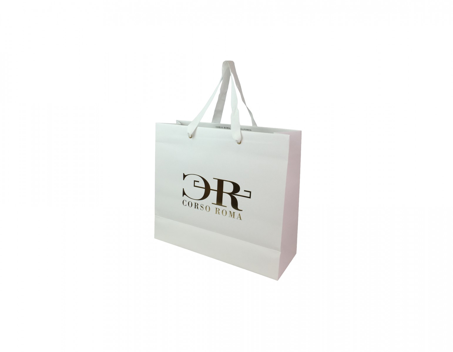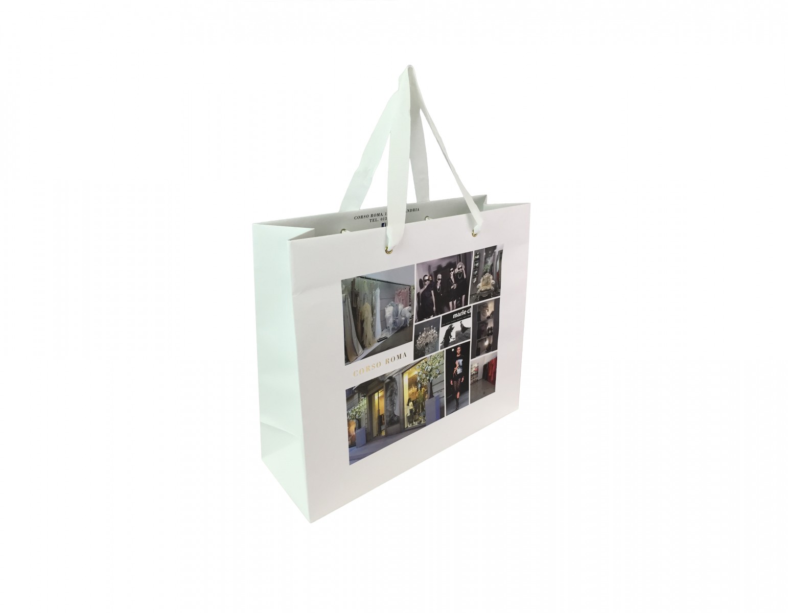 Shopper realizzata in carta patinata da 200 gr con stampa in quadricromia, ideale per riprodurre foto dello store o dettagli specifici in alta definizione, conferendo grande impatto visivo.