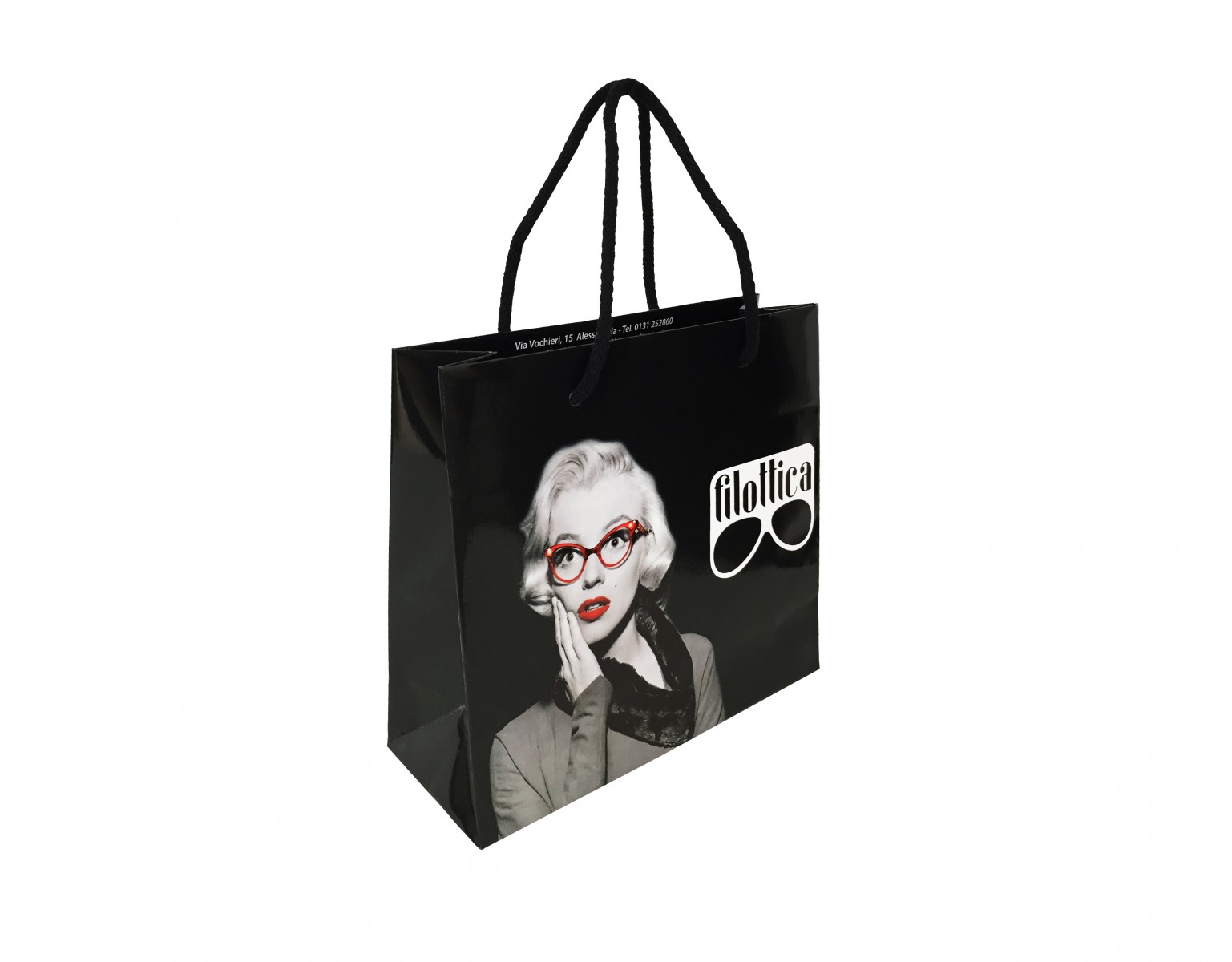 Shopper realizzata in carta di alta qualità con plastificazione lucida per una finitura raffinata.