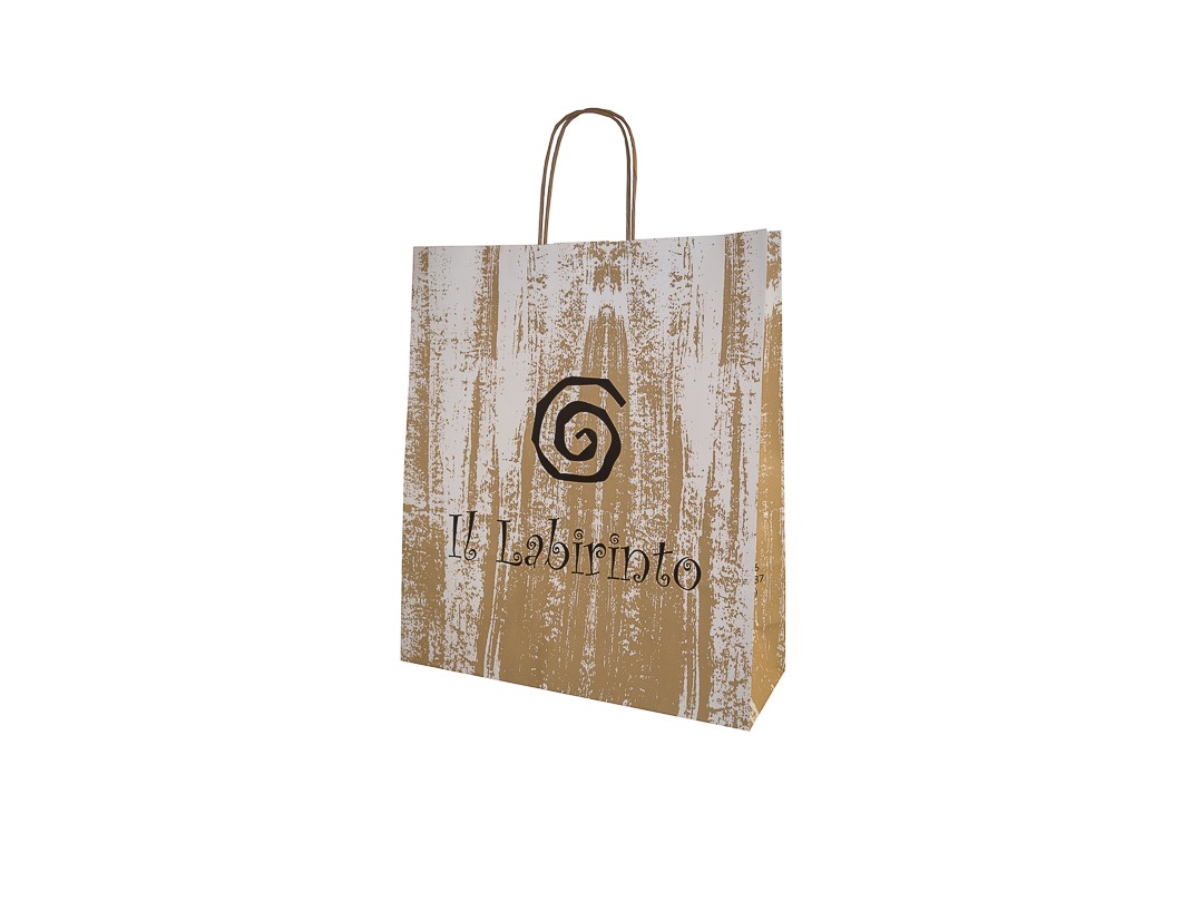 Shopper realizzata in carta avana da 100 gr, con stampa flexografica a 2 colori, uno dei quali utilizzato per replicare il motivo del muro del cliente.