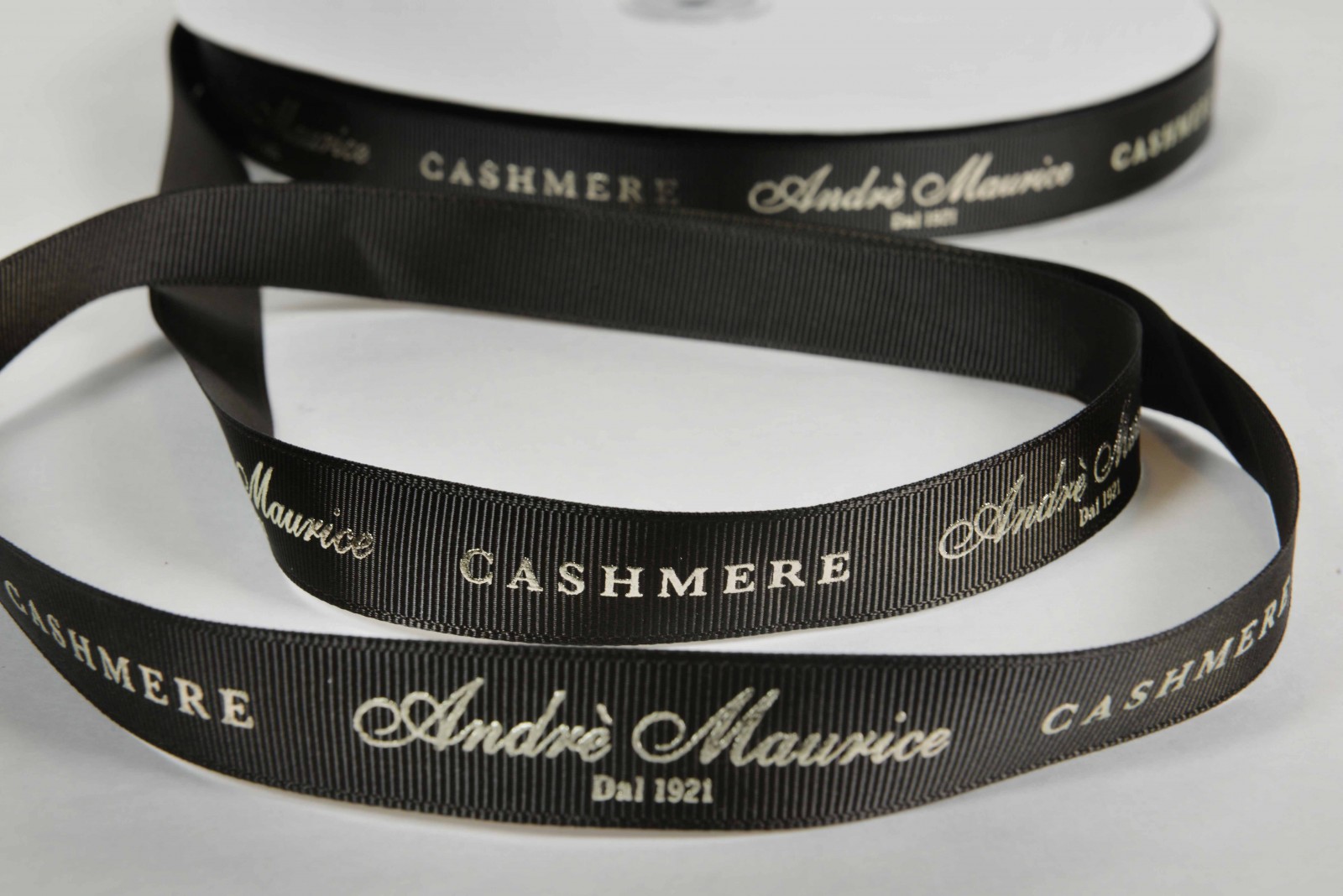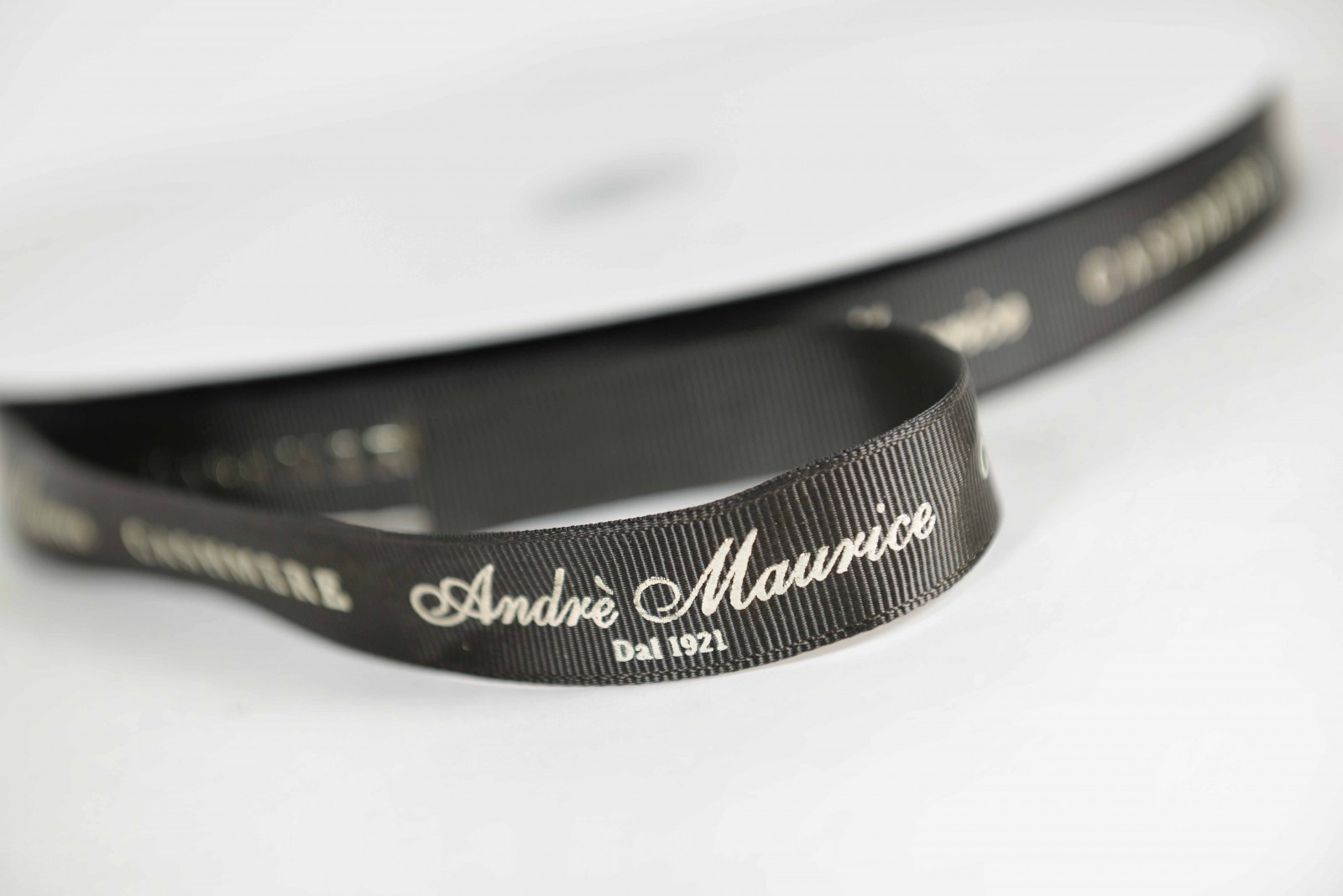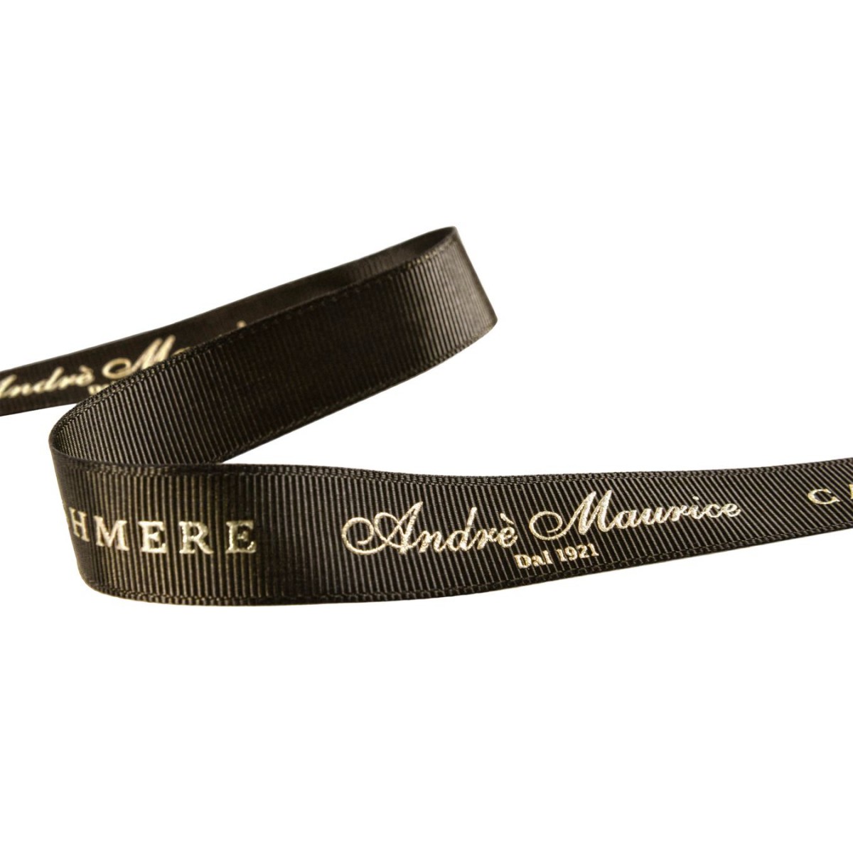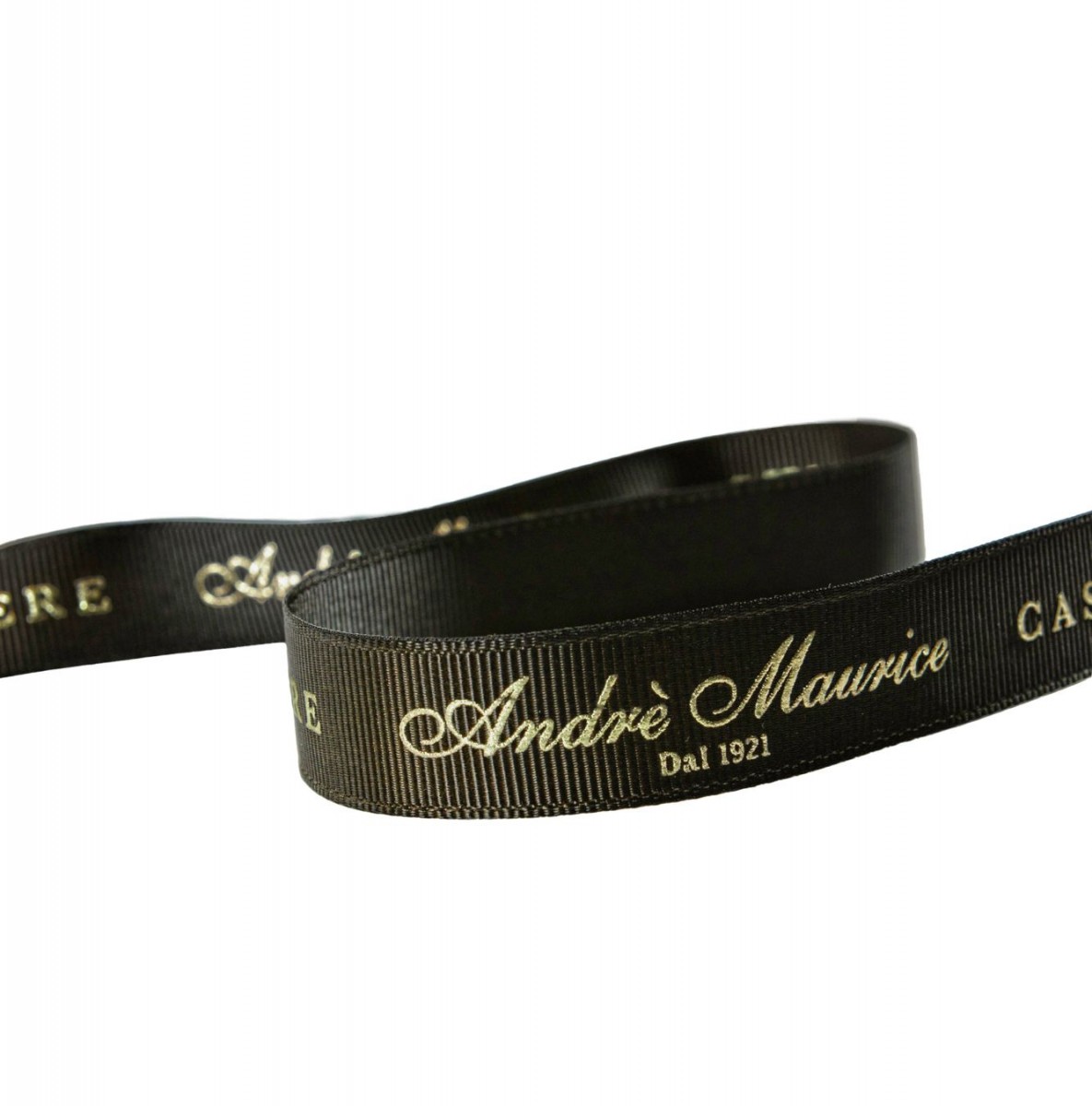 Nastro in gros grain di alta qualità con logo personalizzato a rilievo oro.
