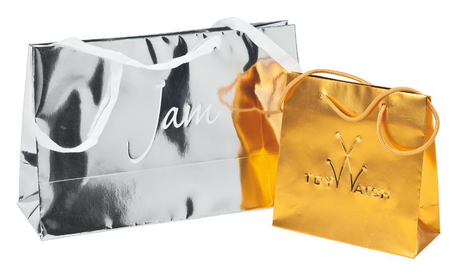 Shopper realizzata in carta di alta qualità accoppiata con film cromo oro o argento, che crea un effetto specchiato unico e raffinato.