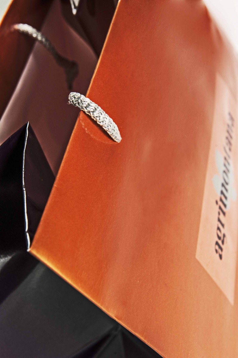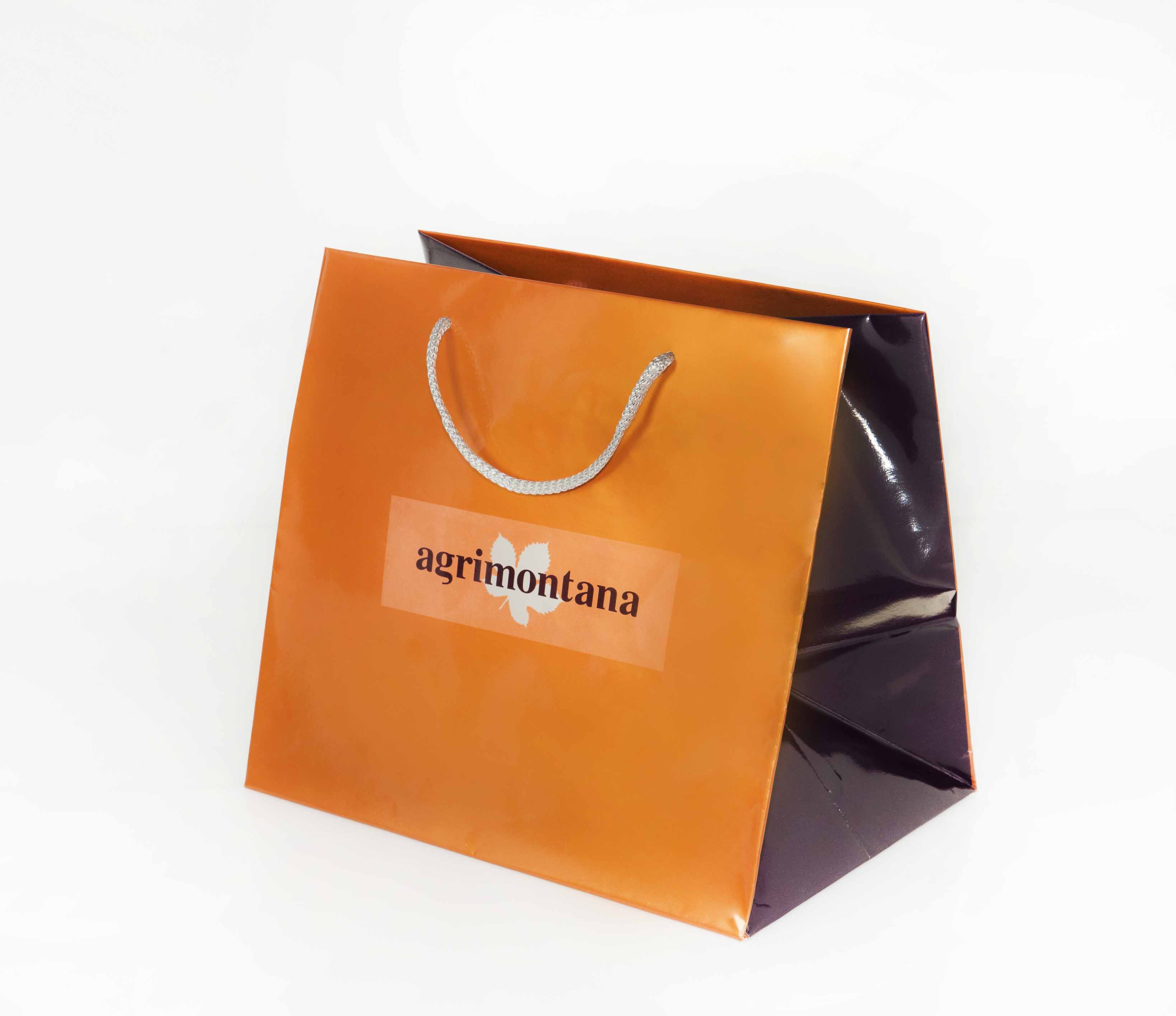 Shopper realizzata in carta patinata da 170 gr con stampa a 3 colori speciali metallizzati, per un effetto raffinato e di pregio.