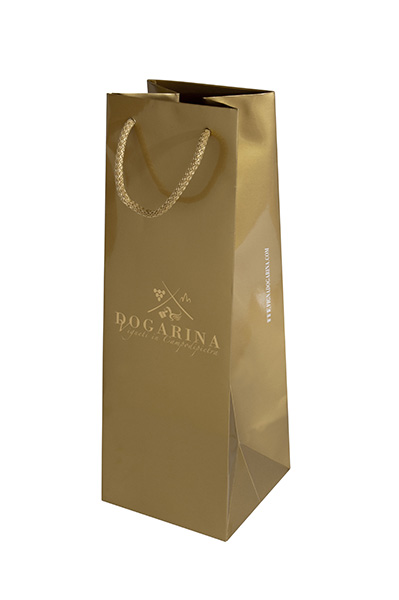 Shopper portabottiglia singola realizzata in carta patinata da 170 gr con finitura plastificata lucida, per un effetto brillante e raffinato.