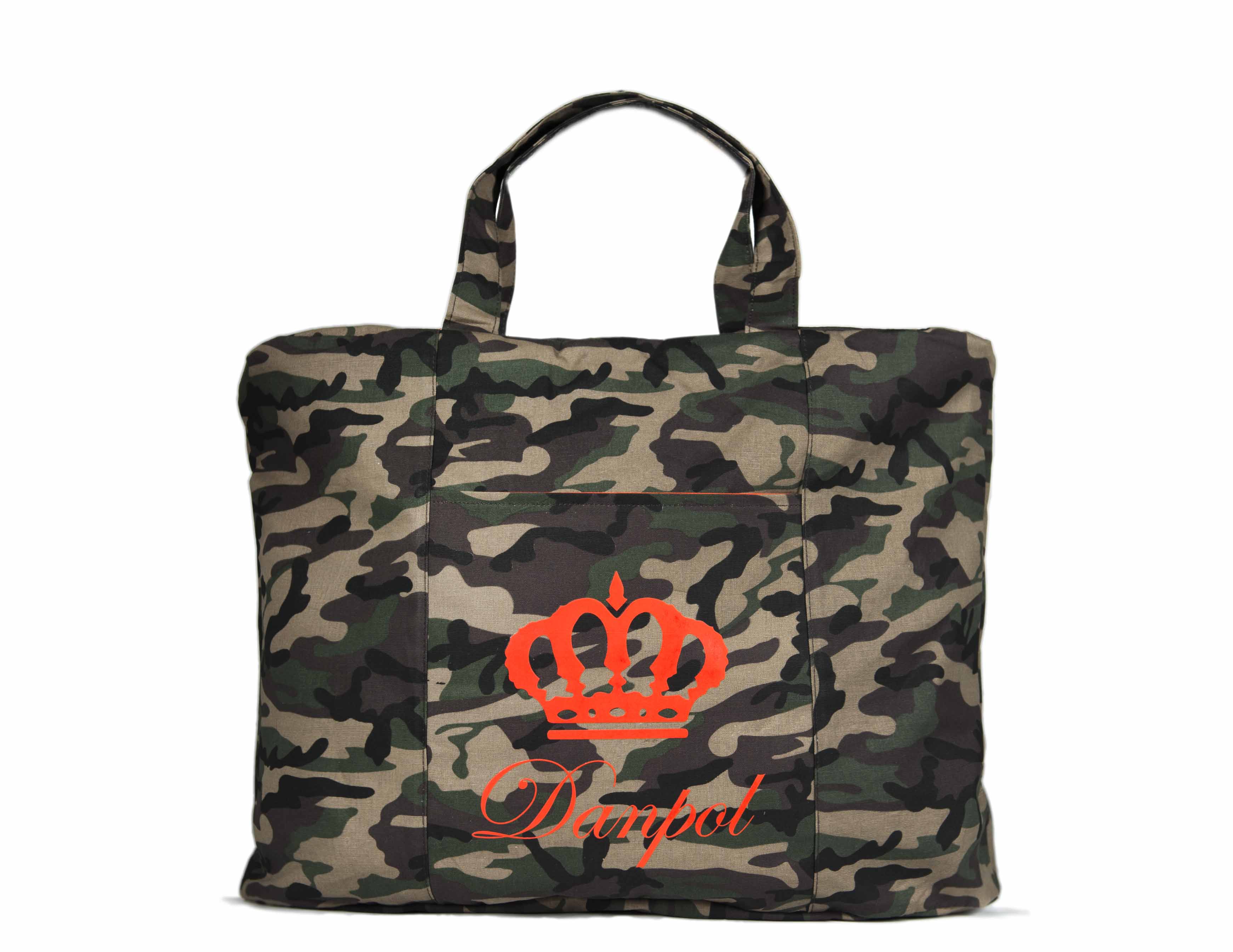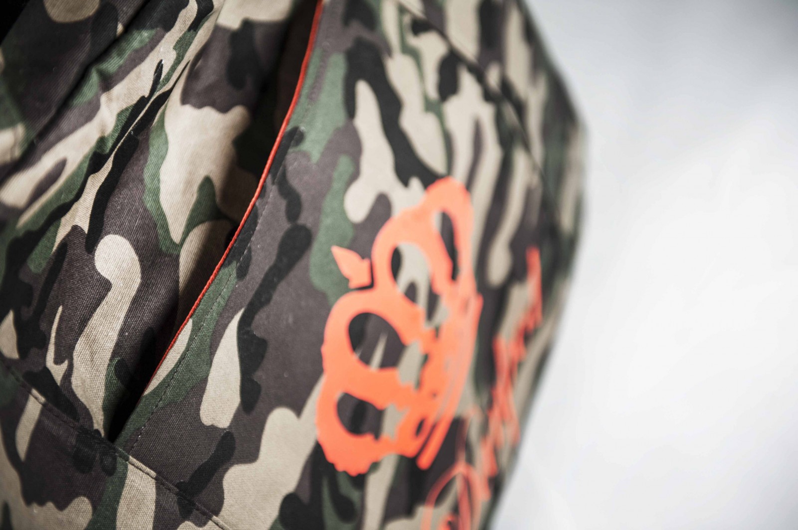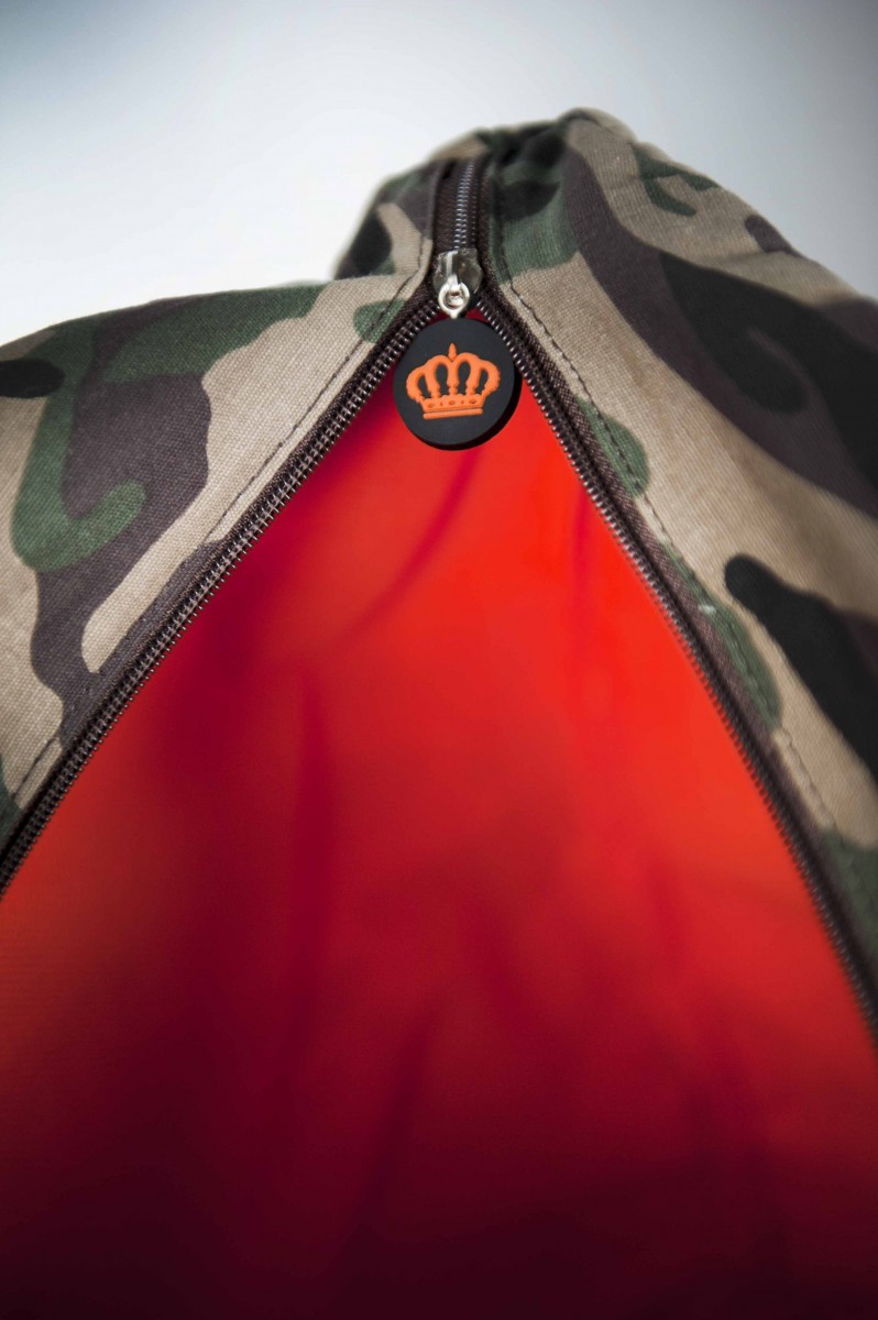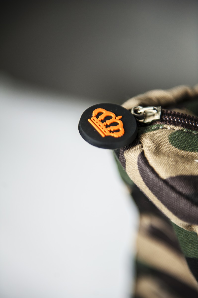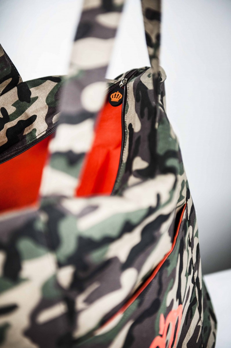 Realizzata in cotone 10 once stampato camuflage, logo su tasca anteriore in materiale gommato