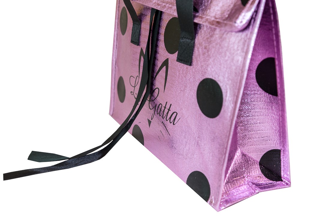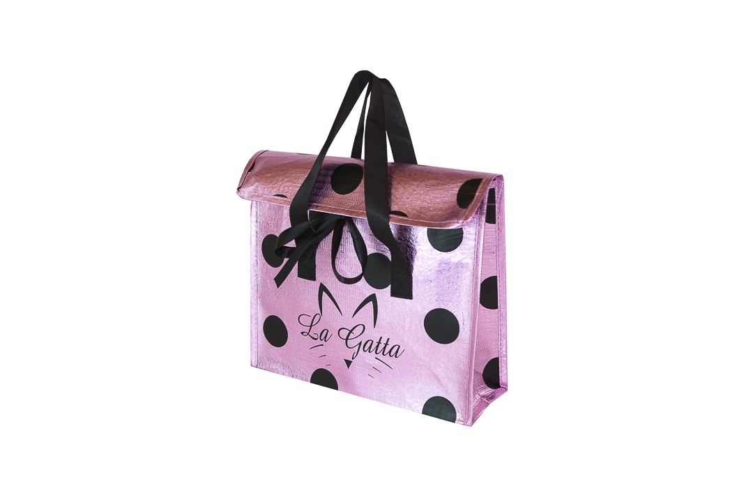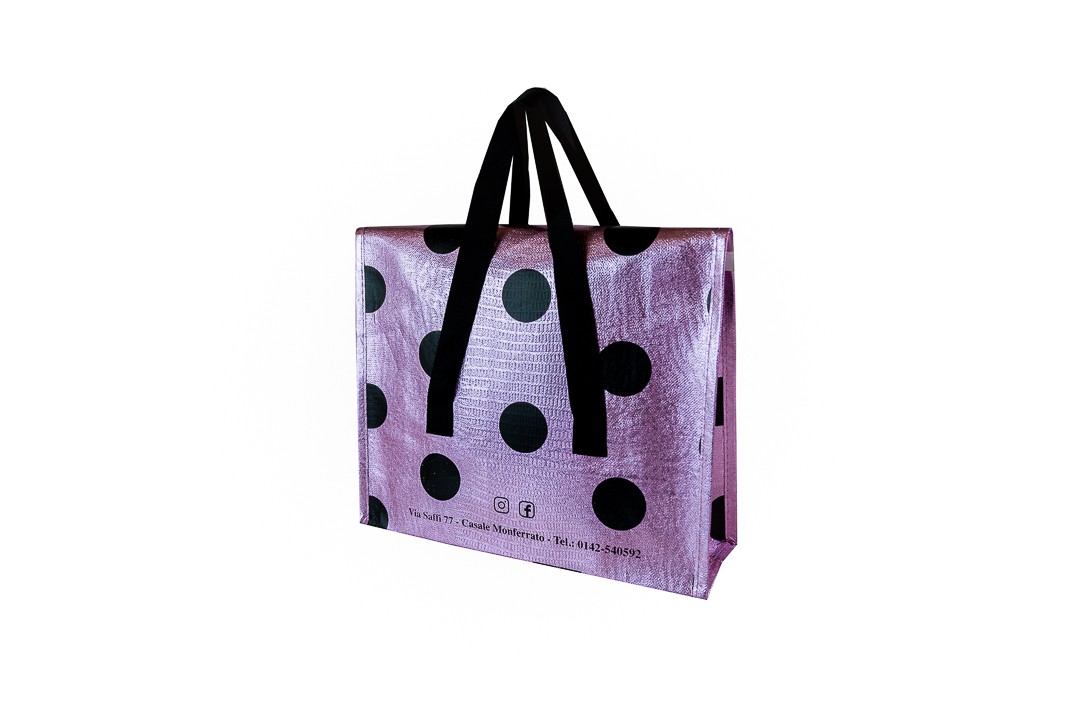Shopper a cartella realizzata in TNT da 140 gr, con finitura laminata metallizzata lucida per un aspetto raffinato e resistente.