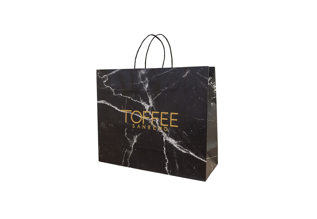 Shopper elegante con grafica accattivante, resistente e raffinata, ideale per valorizzare ogni brand.